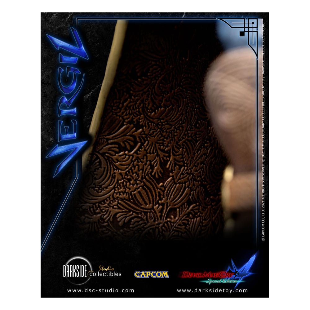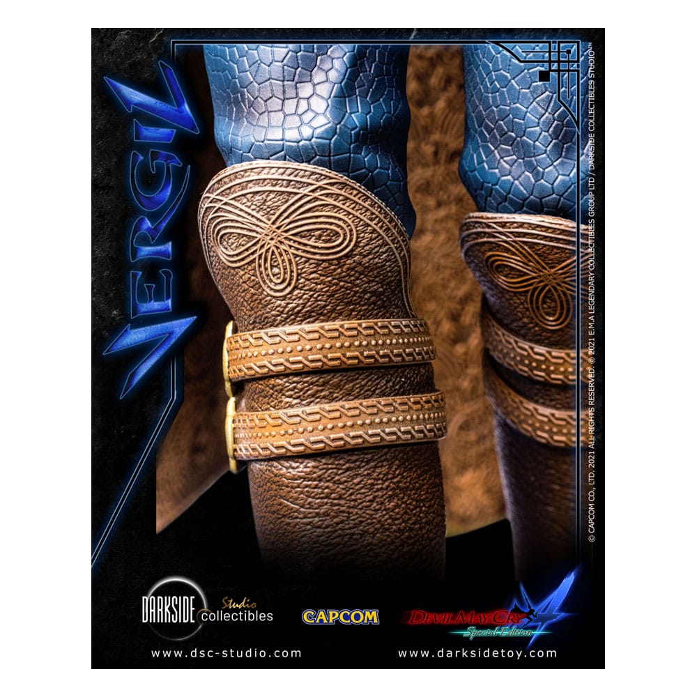 Presented with a defiant look, Vergil stands tall holding his weapon of choice, Yamato. This katana comes with a secondary display option, allowing Vergil to hold the sheathed Yamato in one hand while brandishing Force Edge in the other. This is the second statue in the Darkside Collectibles Devil May Cry Series.
