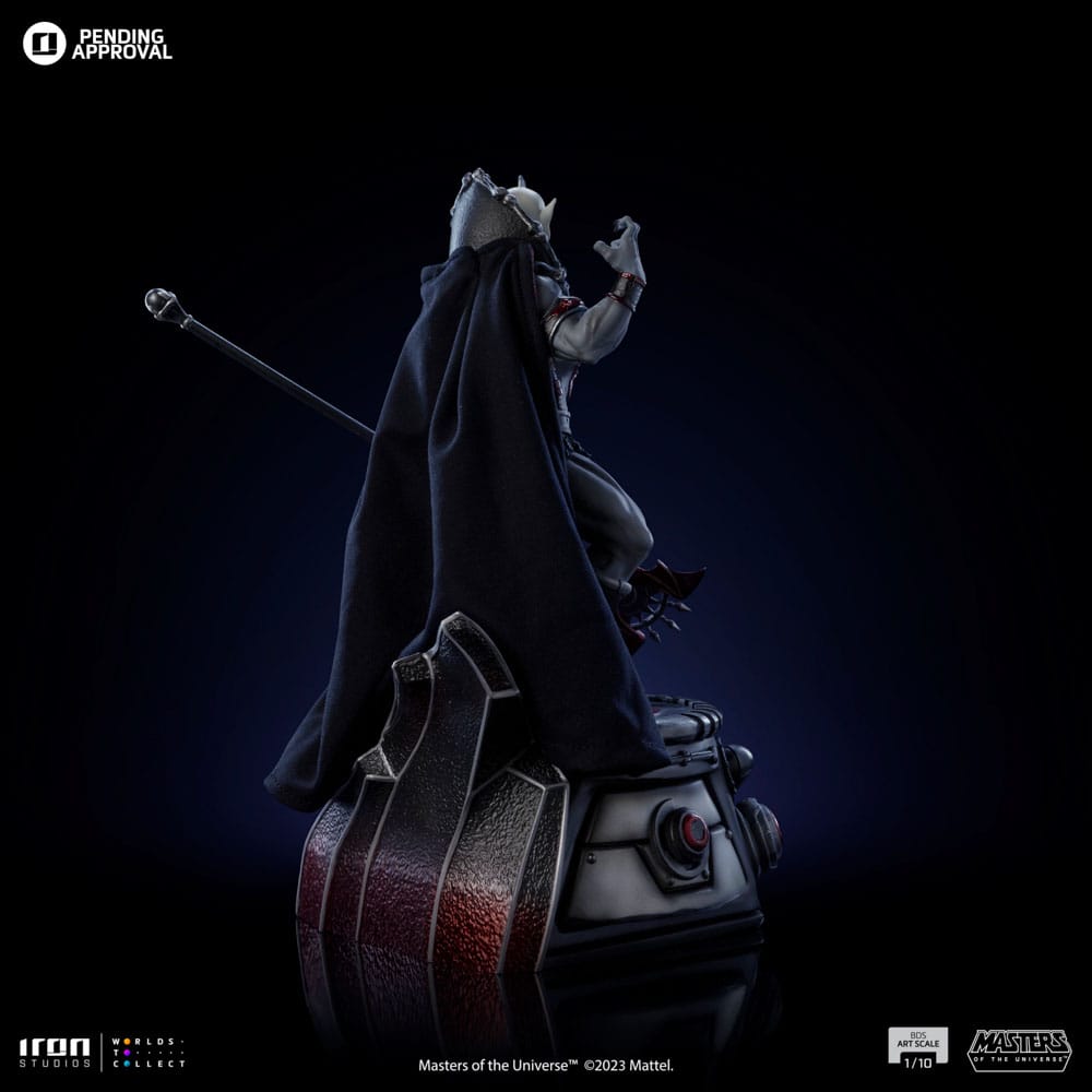 In his techno industrial headquarters in the Fright Zone in another dimension, the tyrant commander of the Horde on planet Etheria raises his hand, while contracting his fingers in a gesture to demonstrate impatience and resentment, wielding his staff in his left hand with the symbol of the Horde’s red bat in the tip of the staff, he climbs the stairs of a metallic floor. With his grotesque white bone colored face, penetrating red eyes, flat snout like nose, red vampire fangs, and pointy bat like ears, Iron Studios present the variant statue “Hordak Comics V er. Masters of the Universe Art Scale 1/10″ 10”, based on the comic book and Toys version, in which the villain leader of the Evil Horde, archenemy of She Ra, twin sister of He Man, is portrayed with a grey skin tone and black, red, and silver armor, with the back covered by a scarlet cloak. Produced i n a limited and numbered edition with only 300 statues available worldwide.