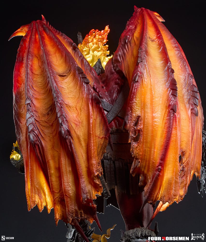The Arethyr: War Statue measures 20.6″ tall x 23.44″ wide x 13.3″ deep, capturing this hellion’s hunger for battle. The warmonger brandishes the flaming Aetherblade sword as he storms over a field of broken armaments and fallen fighters. His devilish form exudes brute strength, with leathery wings poised to unfurl. Arethyr is protected by wicked black armor forged in the ruthless fires of conflict, with monstrous horned pauldrons on either shoulder and a matching belt ornament across his waist. His grimacing portrait is guarded by a cage-like mask, crowned with a blazing tongue of fire.