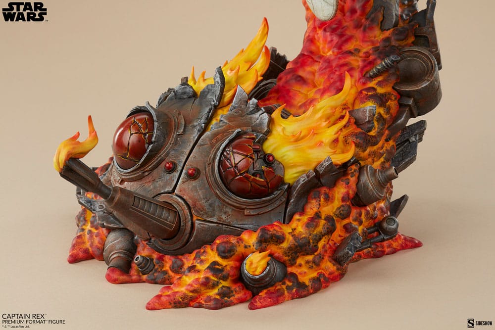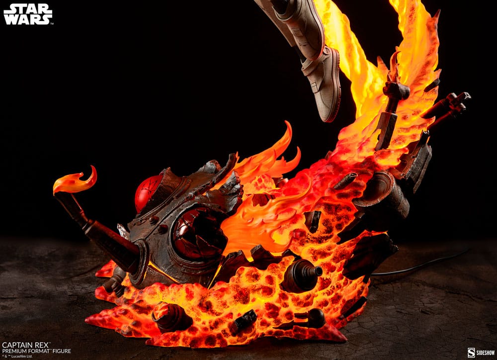 On his command! Measuring 27″ tall, 15″ wide, and 15″ deep, the Captain Rex Premium Format Figure wields dual blasters as he launches into the air above a scorched battlefield. Gray and white smoke plumes twist into the vibrant yellow and orange flames emitted from his jet pack. A broken and burned spider droid™, its pieces scattered and melted in the aftermath, bears the brunt of Captain Rex’s effective assault. With this trooper in the sky, the victory of the Republic’s campaign seems certain.