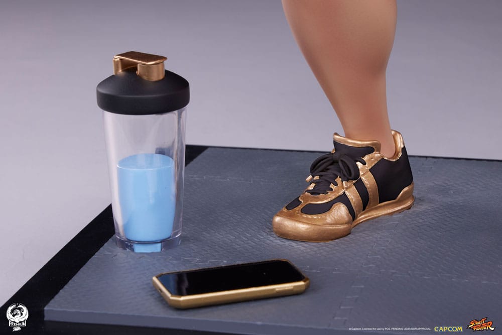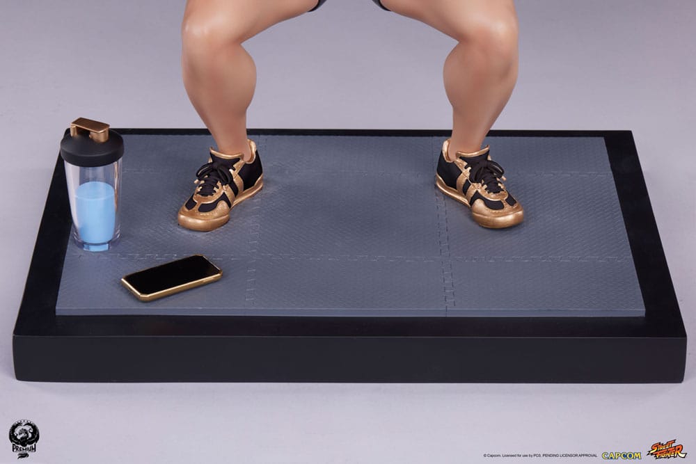 Every detail of the statue is expertly painted, showcasing a more casual take on Chun-Li’s fan-favorite evening wear look. Her black shorts with gold trim are a perfect match for her stylish sneakers and lifting gloves. The detailed plates at either end of the barbell sag under their own weight showing just how much hard work is needed to pull off the powerful kicks Chun-Li is known for.